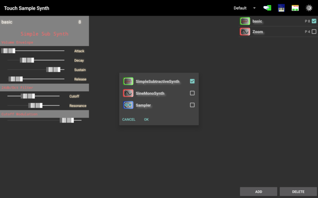 • 3 Different Instruments: Sine Wave Synth, Subtractive Synth with sweepable Filter, Sample Player