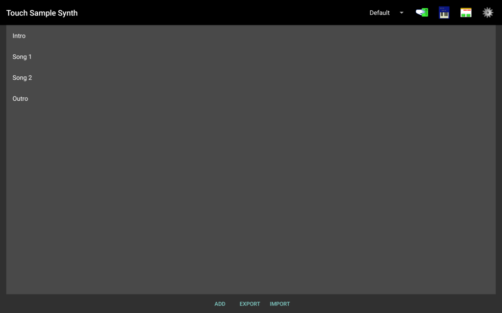 Play Page: Contains the touch pads assigned to different voices. Size, Color, Drag Direction and Instrument assignment is defineable